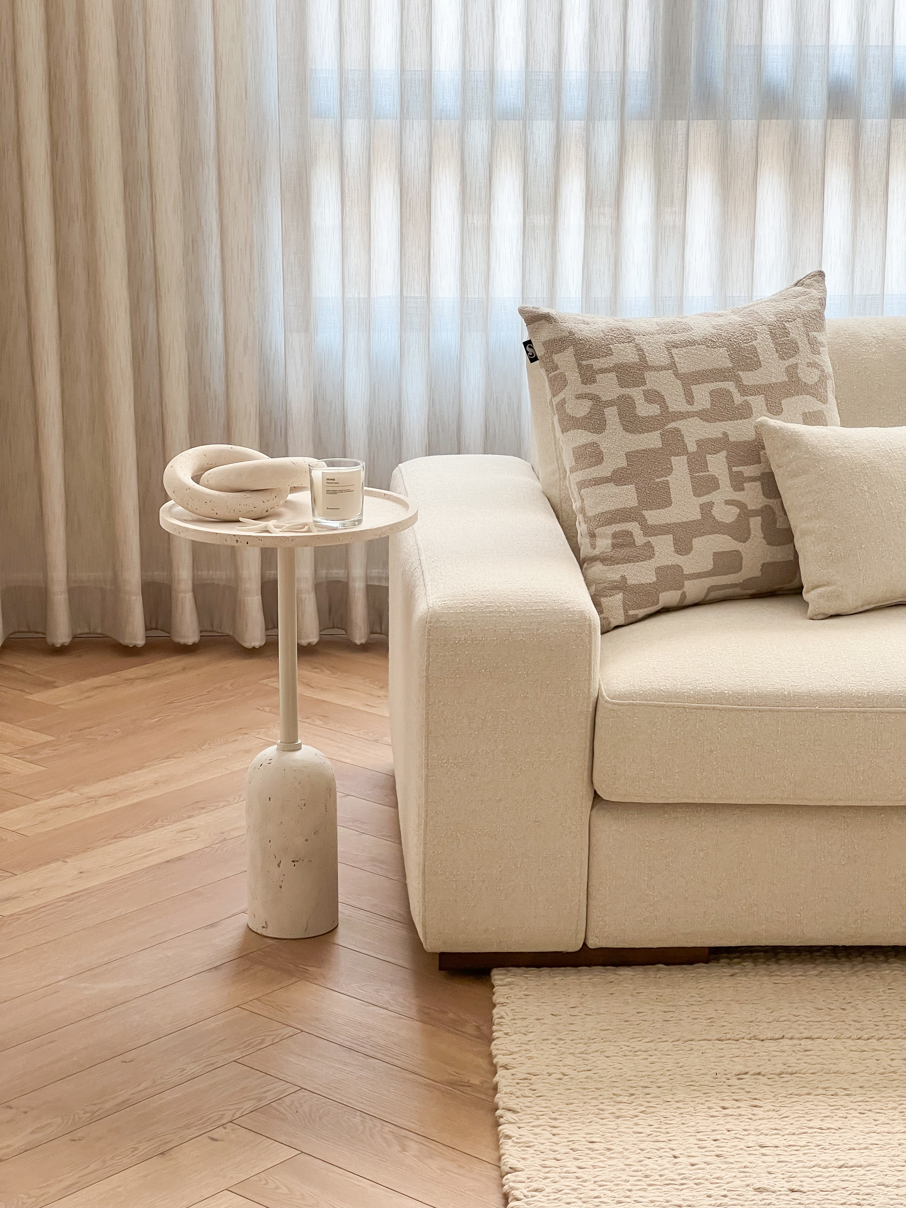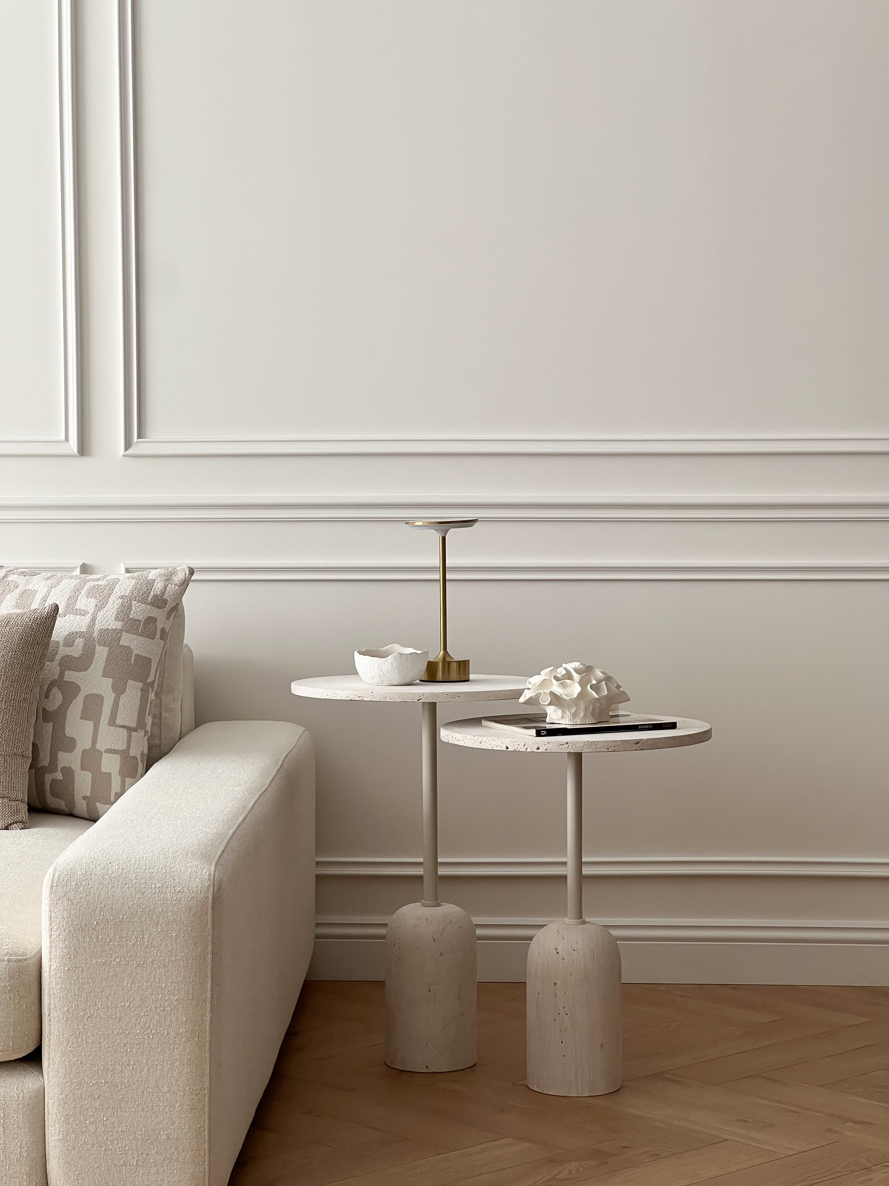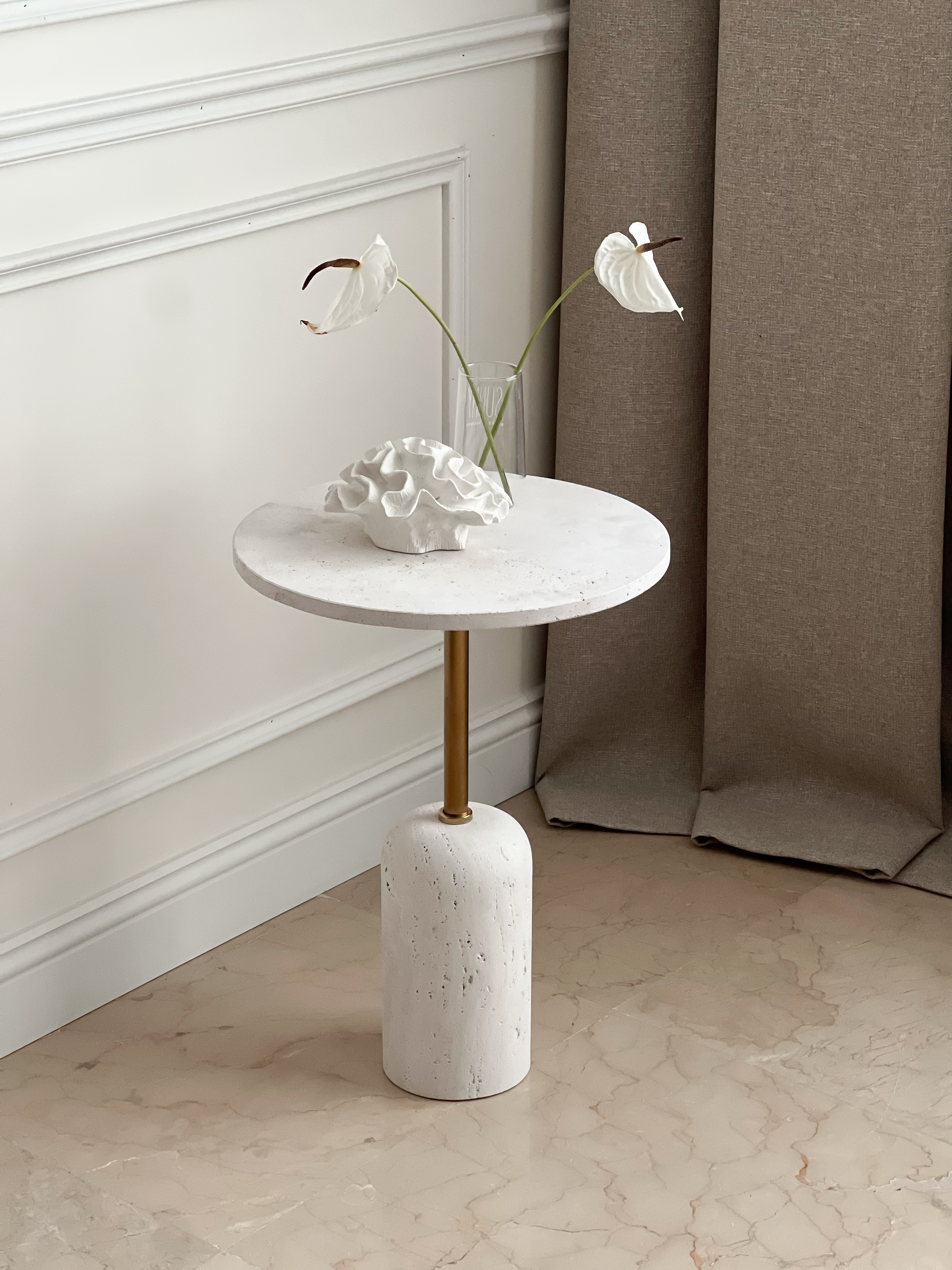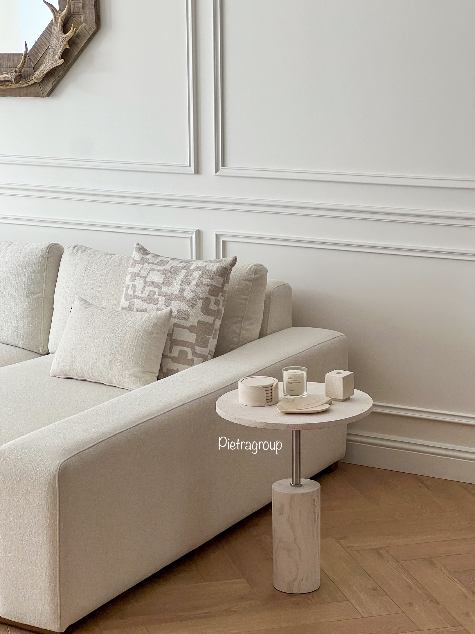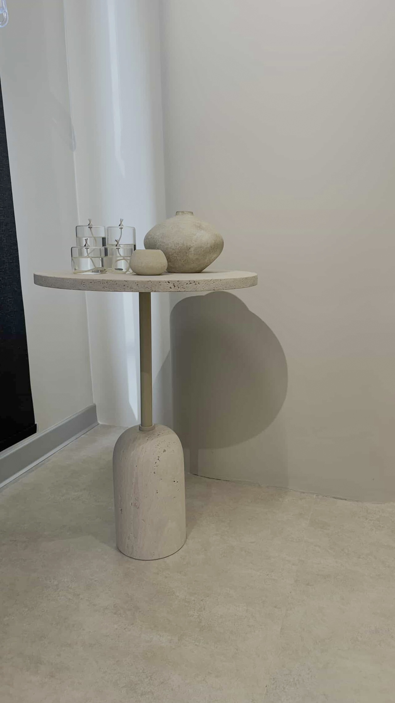 کنار مبلی ترکیب سنگ تراورتن و فلز کرم با رویه سنگ